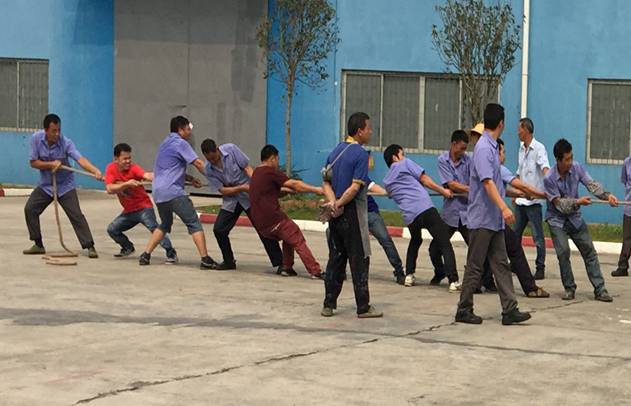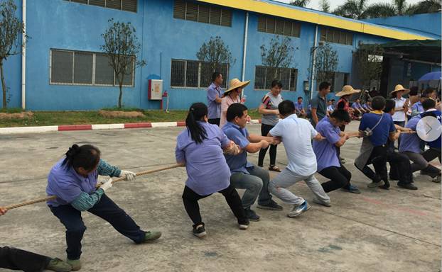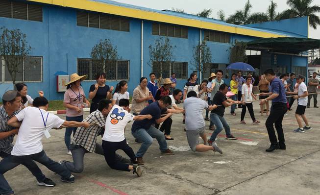 此次拔河比赛参赛队伍有4支,每队10人,由8名男员工与2名女员工组成。比赛实行淘汰制晋级方式,抽签分组决定比赛对手与顺序。随着裁判一声“预备”,各队比赛选手各就各位,紧紧握住手中长绳,蓄势待发,如同箭在弦上,一触即发。裁判员 “开始”哨声一响起,比赛选手憋足了劲拼命往后拉,啦啦队在旁边一同高呼“加油,加油”,呼声一浪高过一浪,此起彼伏,飘荡在整个和利化工/三盈树脂的上空。