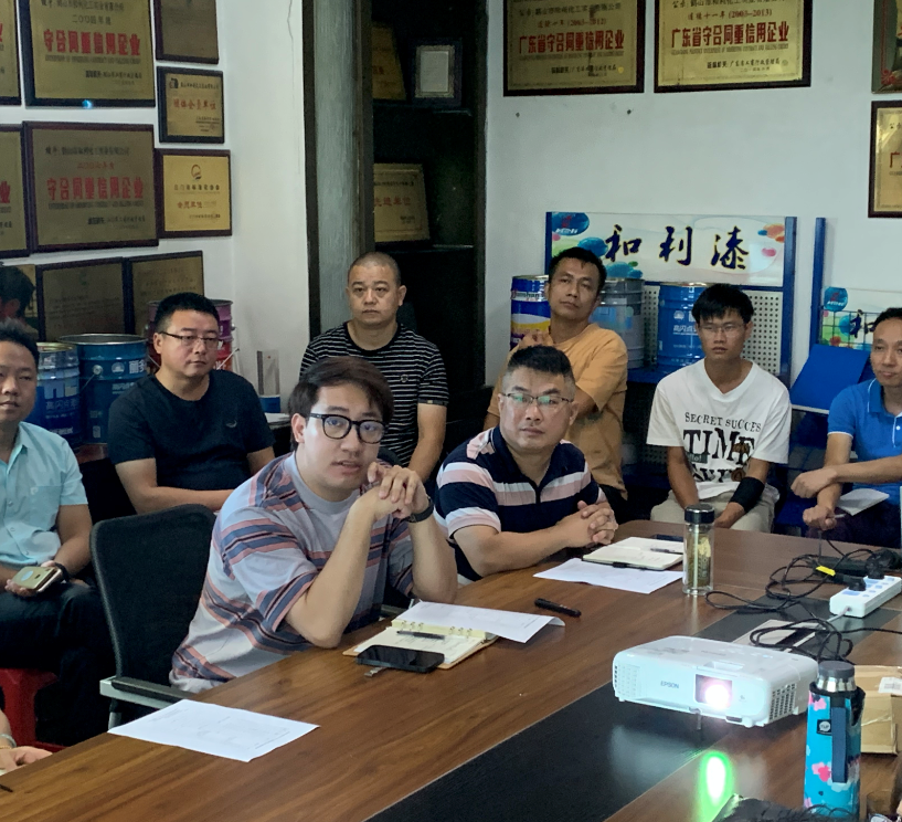 第二天,新品赋能培训会如期进行,技术部工程师李强对公司近期推出市场的产品:环氧富锌底漆、云铁环氧防锈中间漆、高级单组份丙烯酸涂料和丙烯酸反光漆的各项性能和参数原理进行全面剖析。培训内容全面且实用性强,在加深大家对新品的了解程度之余,推动产品走向市场。