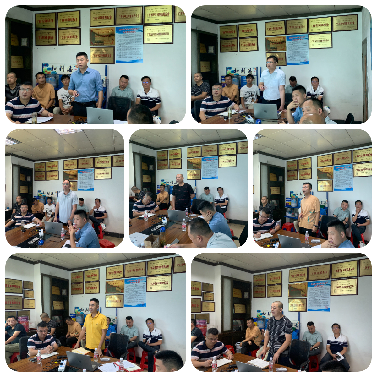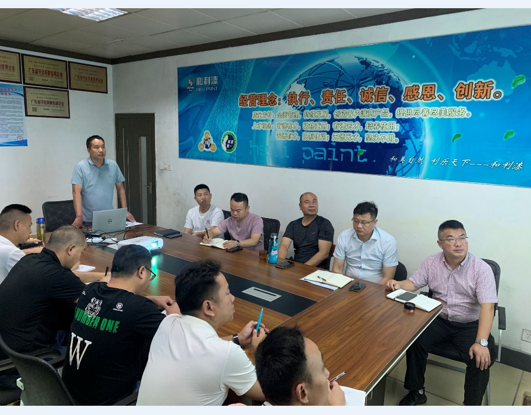 2022年7月1日-2日,和利化工召开年中述职报告大会暨新品赋能培训会,会议旨在组织工业漆销售部人员总结工作成绩、谋划下半年发展并培训新品性能,为公司下半年的营销布局做好充分准备。董事长戴咏新、总经理戴志祥、常务副总付仲好、销售总监方亮、技术部工程师李强、财务部和工业漆销售部各片区负责人参加会议。