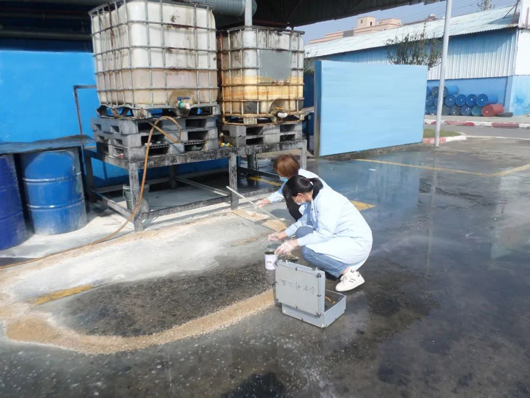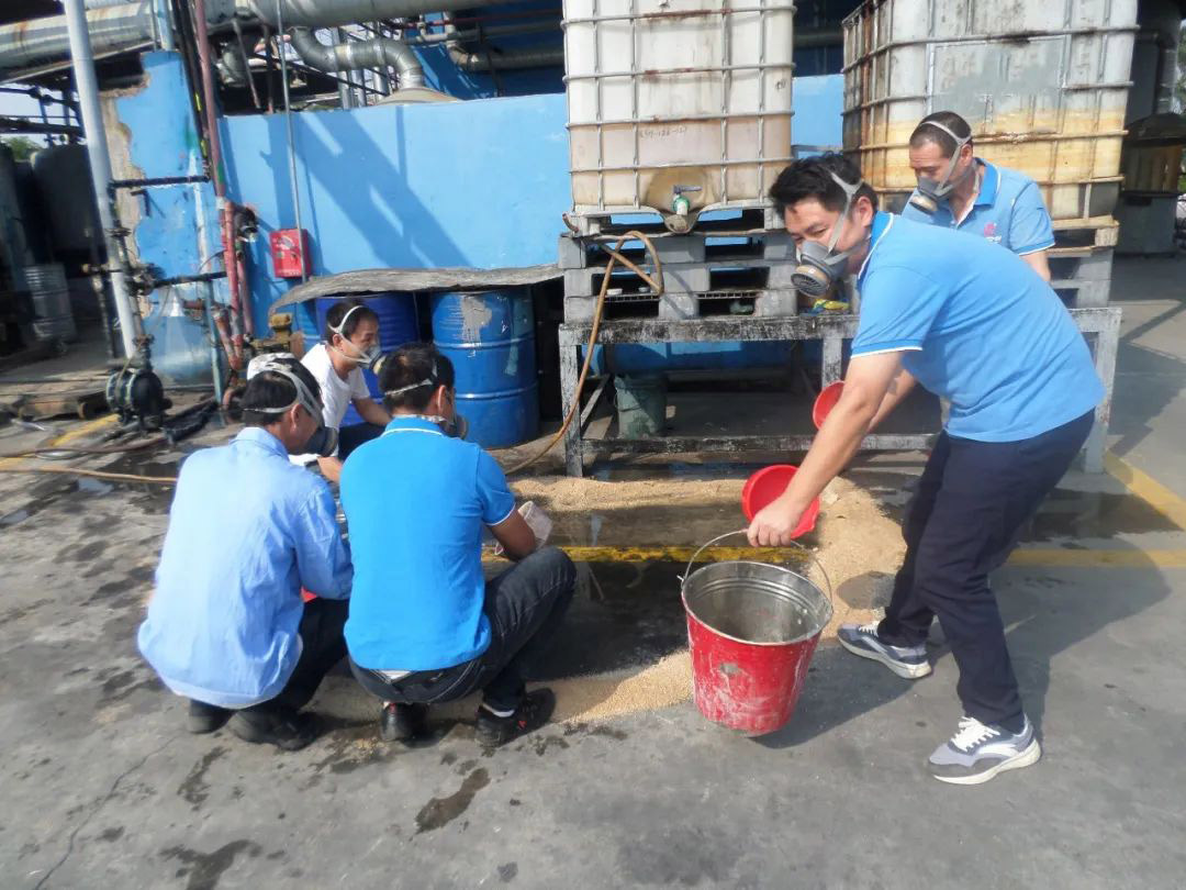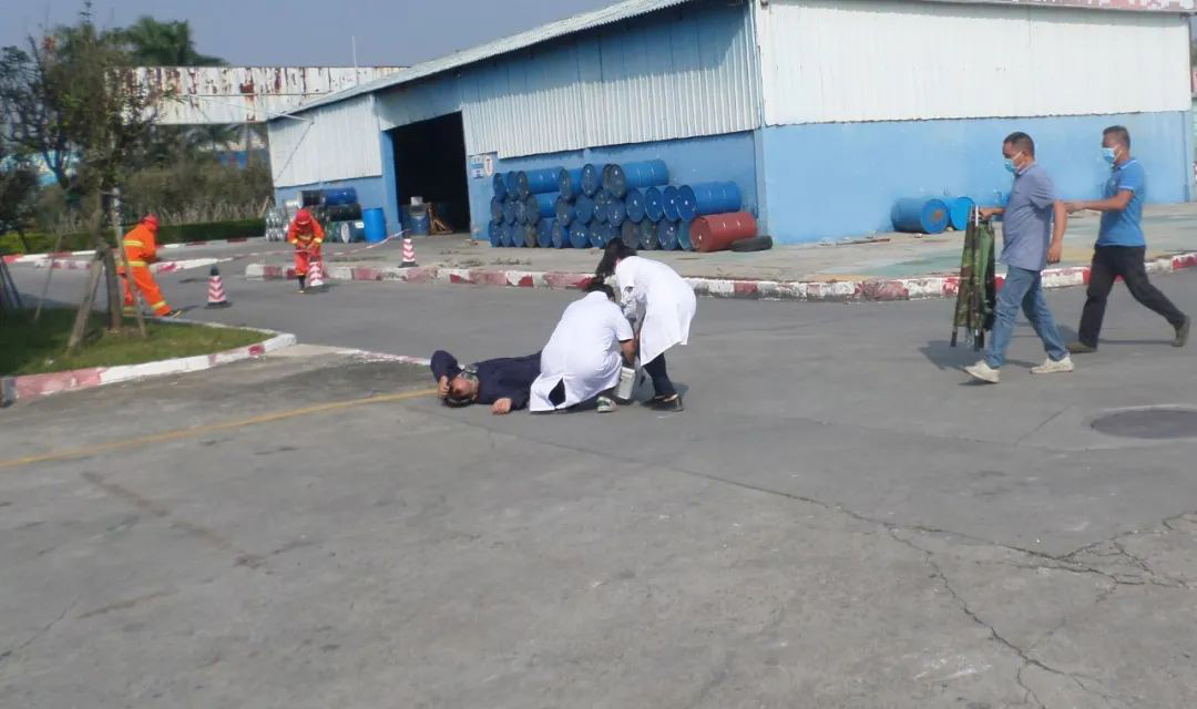 演练开始,应急指挥部将参与演习的人员分为评价人员、应急小组、灭火小组、增援小组、救护小组、环评小组和机电保障组,对担架救助伤员、使用消防沙围堵污染物防止泄漏扩散、练习把污染物收集处理的能力、练习使用灭火器灭火、练习紧急情况下应急池阀门应急转换接收污水、练习使用管道泡沫进行灭火、练习消防水带的使用和检验车间主管的应急处置能力等方面进行重点演练。随后,大家小步快走,沿着预定的疏散路线,快速有序的撤离到安全地带,各部门负责人迅速整理队伍,清点人数,向总指挥汇报。
