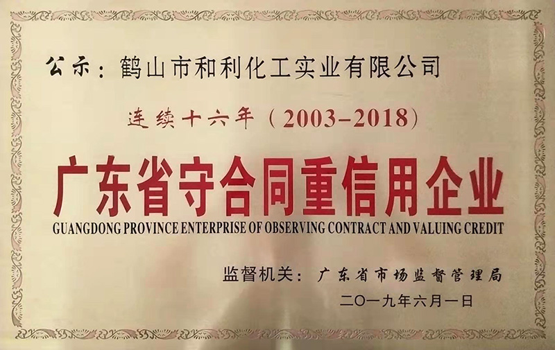和利化工连续十六年获得“广东省守合同重信用企业”荣誉证书